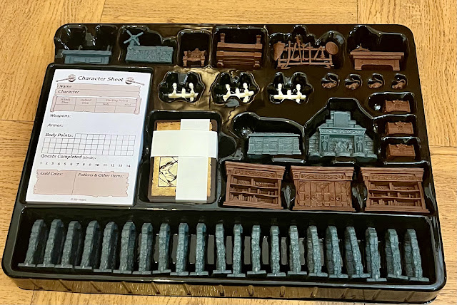 Right off the bat I can tell you that this box is much thicker than the original game! Despite the thickness the contents look surprisingly similar. A nice fold-out board with that all too familiar lay-out, Two trays of miniature components. A single sheet with some punch-out tokens and the Zargon screen. Finally, it has a slim rulebook and a Questbook.